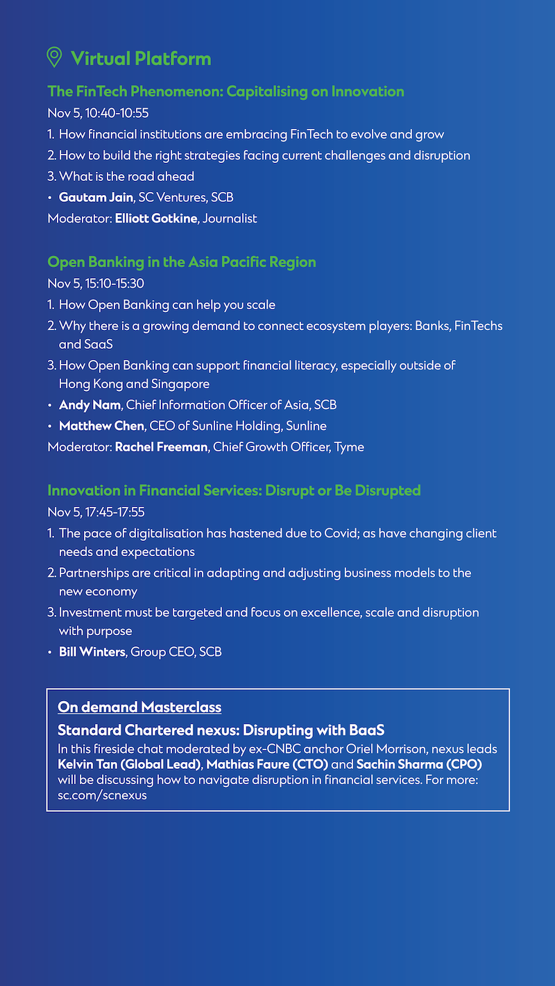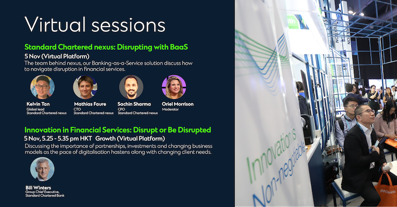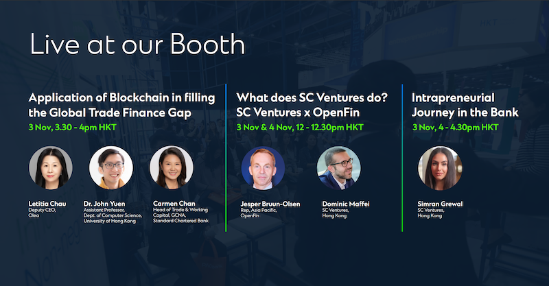 Join us online or visit our physical booth to learn how we’re #RewiringtheDNAinBanking though fintech partnerships, intrapreneurship and our ventures & JVs. Hear from Bill WintersGautam JainLetitia Chau from Olea, our fully-digitised trade finance origination and distribution platform; Jesper Bruun-Olsen from our portfolio company OpenFinAaron Gwak from Liberty, our bond tokenization solution for retail investors, and Kelvin TanMathias Faure and Sachin Rajat Sharma from SC nexus, our #BaaS solution.