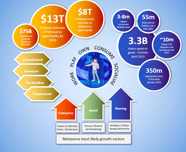 There are competing views on how the metaverse will most likely grow; Gaming, Enterprise adoption and Social networks are generally considered to be the most likely vectors.