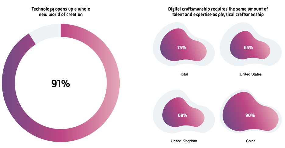 According to a survey by Wunderman Thompson Intelligence, 75% of respondents believe that digital craftsmanship requires the same expertise as physical craftsmanship. This belief is shared by respondents across multiple geographies with China scoring the highest.